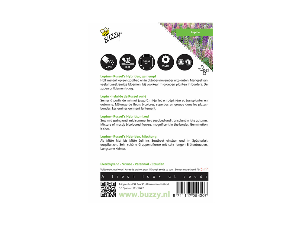 Ce lupin vivace fleurit dans les plus fantastiques teintes pastel. En raison de sa hauteur de croissance de 90 cm, cette espèce est idéale pour une utilisation à l’arrière de la bordure. Lupine Russell’s Hybrids aime un lieu ensoleillé. De préférence semer le lupin en grands groupes.