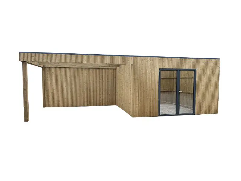 Plusieurs panneaux muraux préassemblés sont placés de côté ou perpendiculairement les uns aux autres et interconnectés. Équipé d’un toit avec des planches de bois de 16 mm et d’un EPDM. Verre trempé transparent.