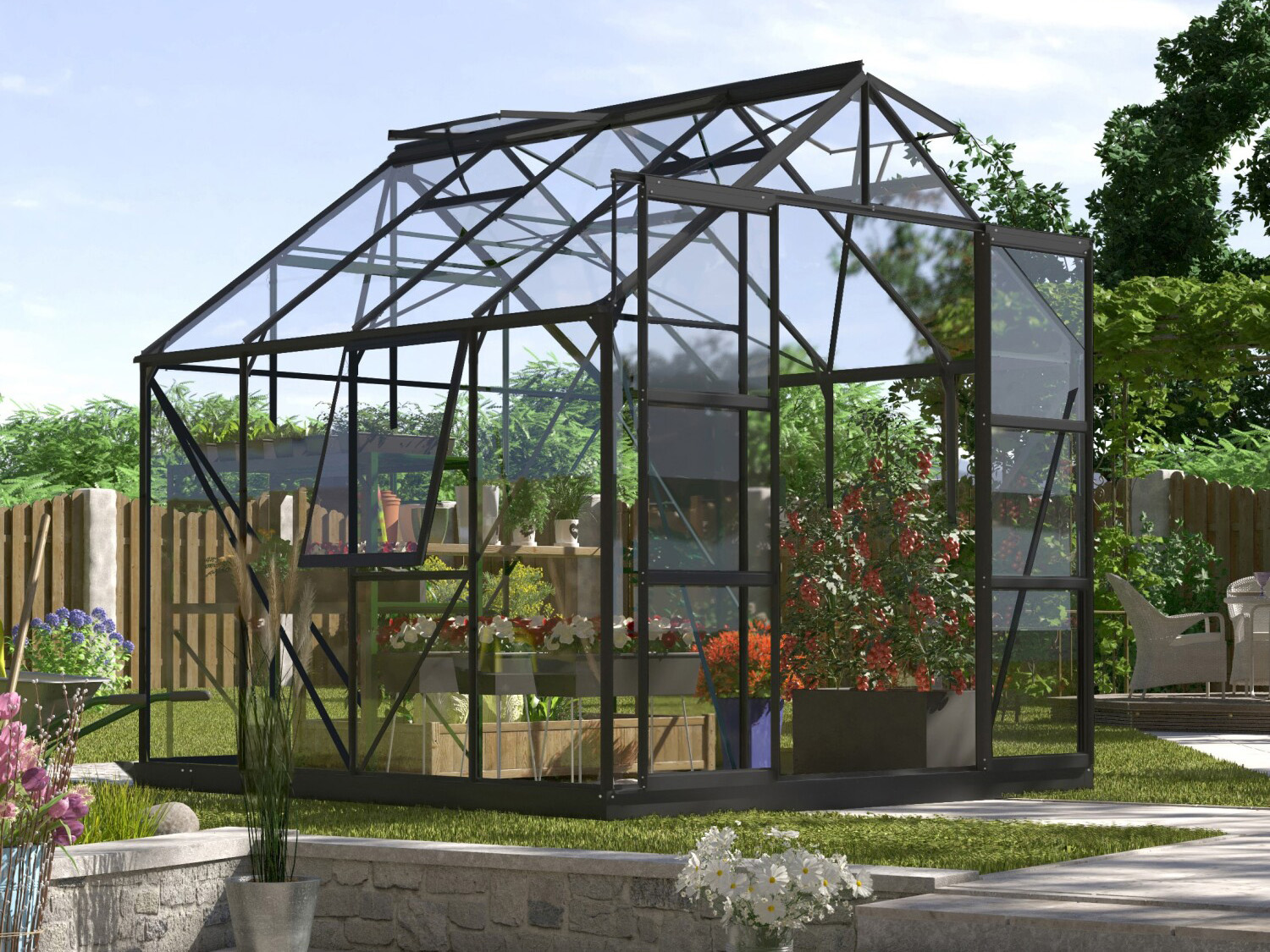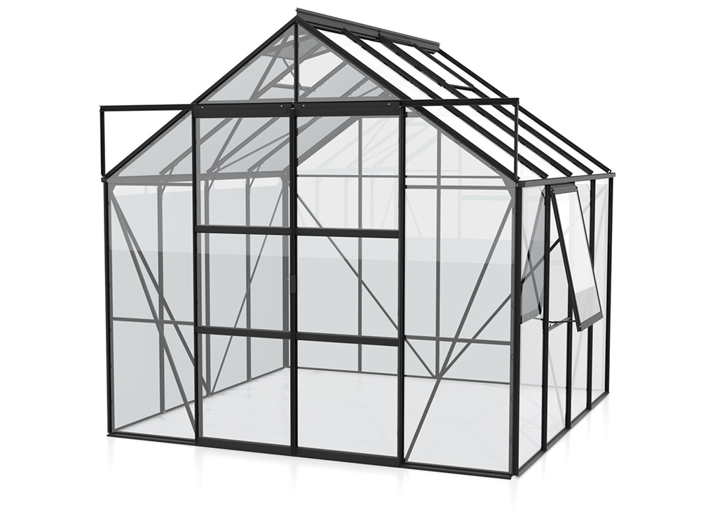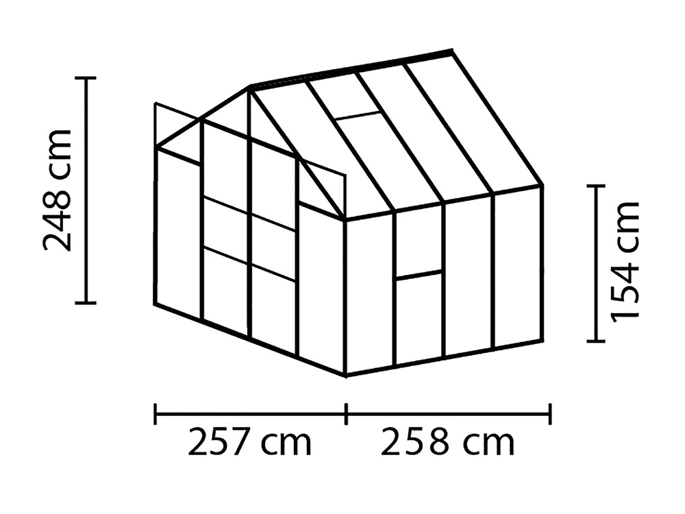Jupiter a une hauteur impressionnante de 248 cm et une largeur de 257 cm. Une hauteur de bord de toit de 154 cm offre plus d’espace pour la tête et d’espace de travail. Une résistance supplémentaire est obtenue grâce à des plaques d’angle et des renforts dans toute la serre, afin que vous puissiez exercer plus de tension sans souci.