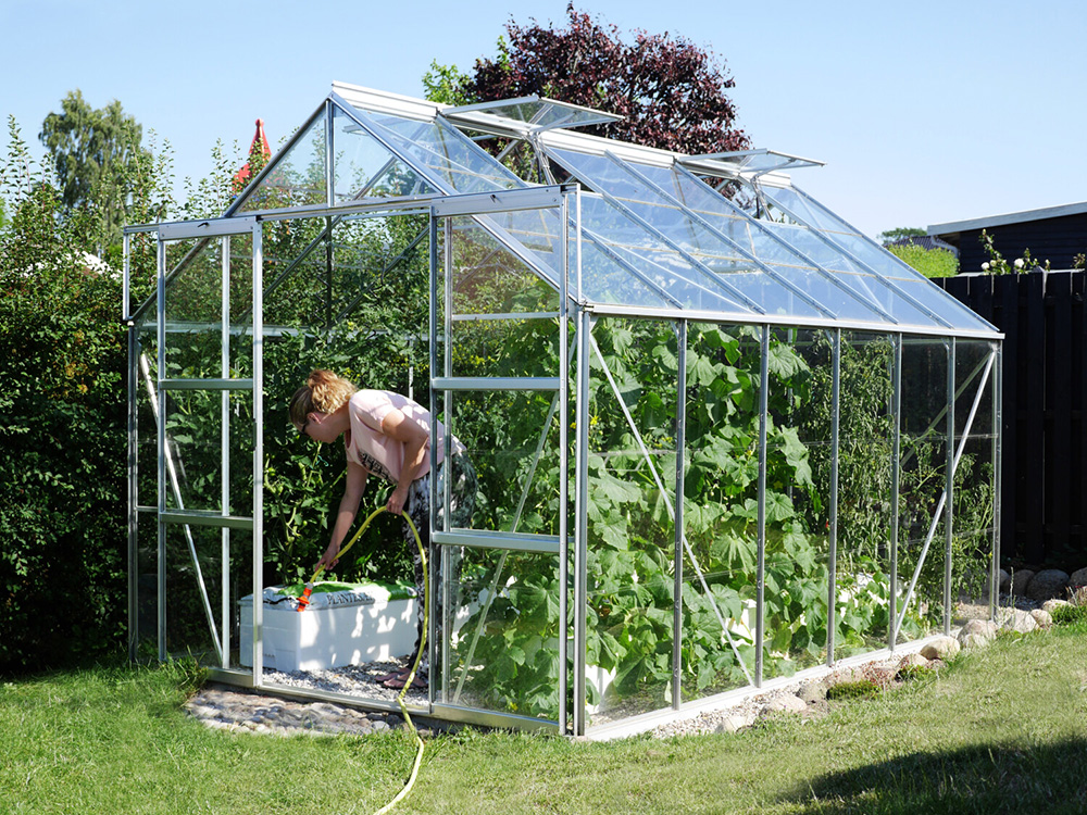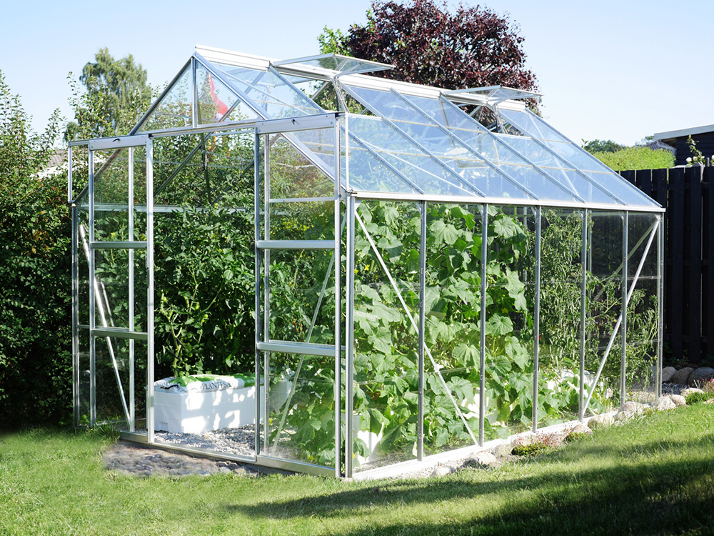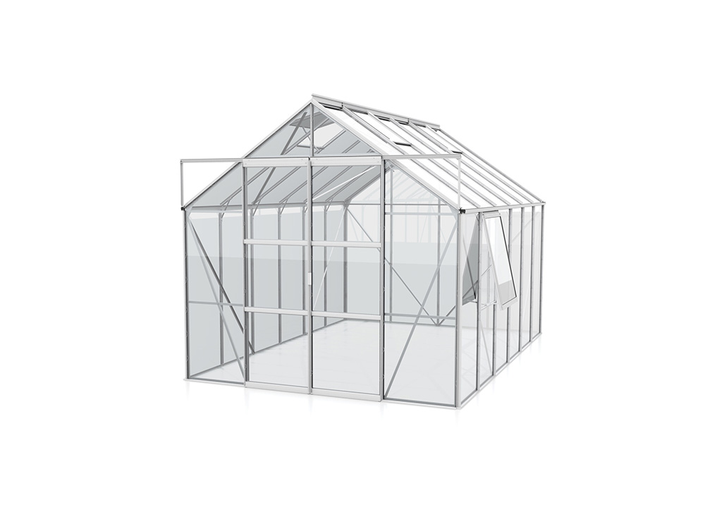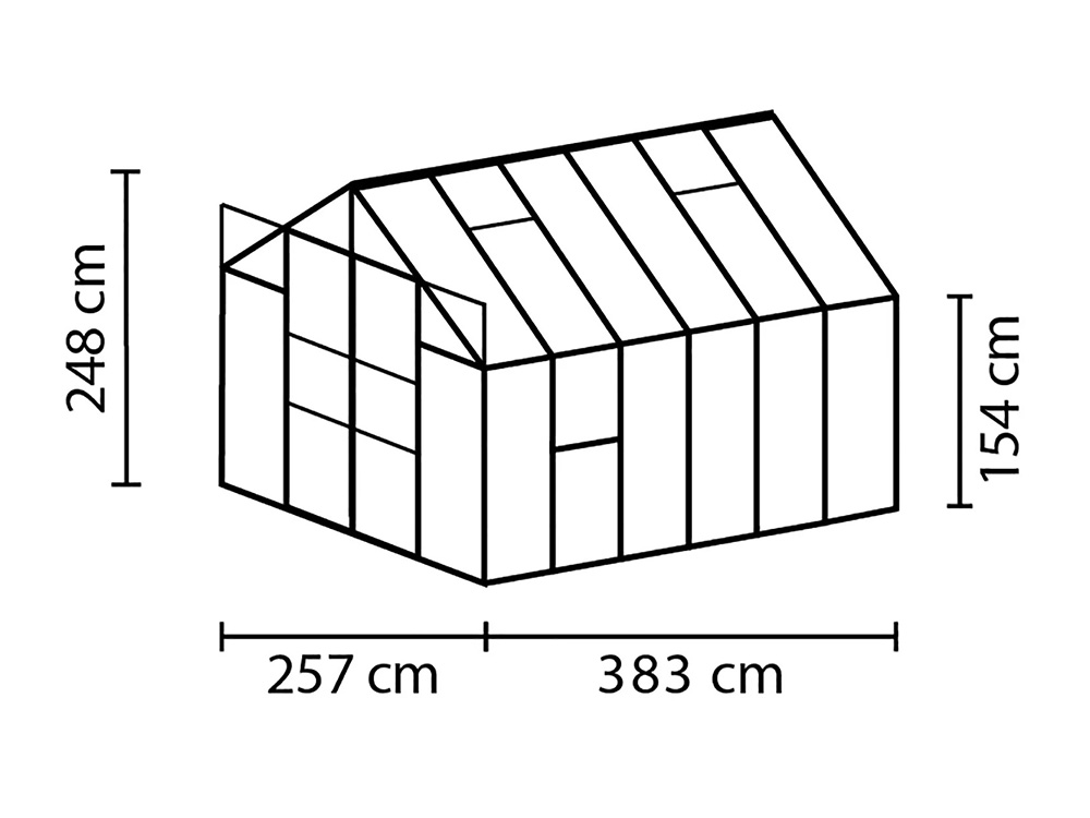 Jupiter a une hauteur impressionnante de 248 cm et une largeur de 257 cm. Une hauteur de bord de toit de 154 cm offre plus d’espace pour la tête et d’espace de travail. Une résistance supplémentaire est obtenue grâce à des plaques d’angle et des renforts dans toute la serre, afin que vous puissiez exercer plus de tension sans souci.