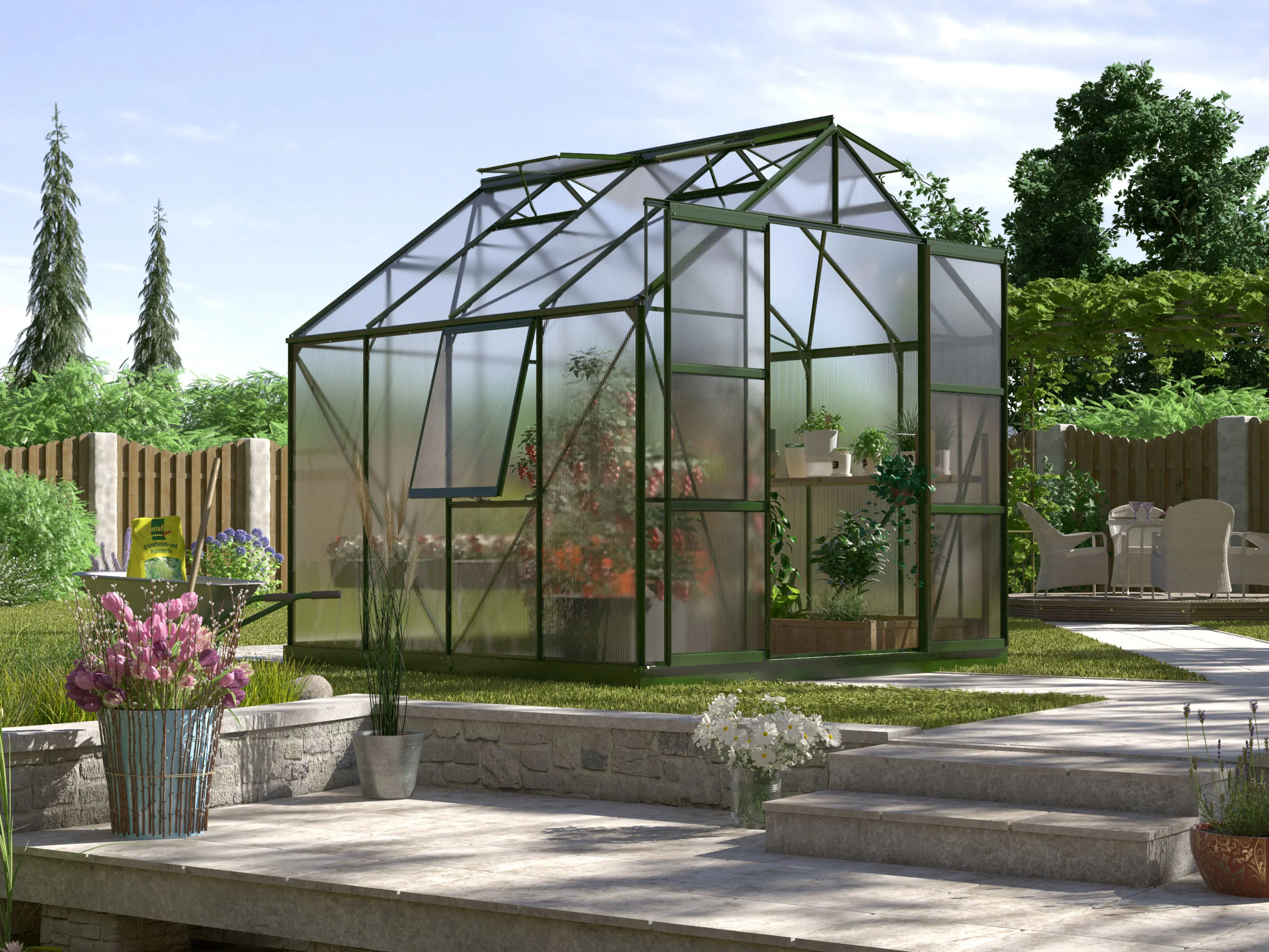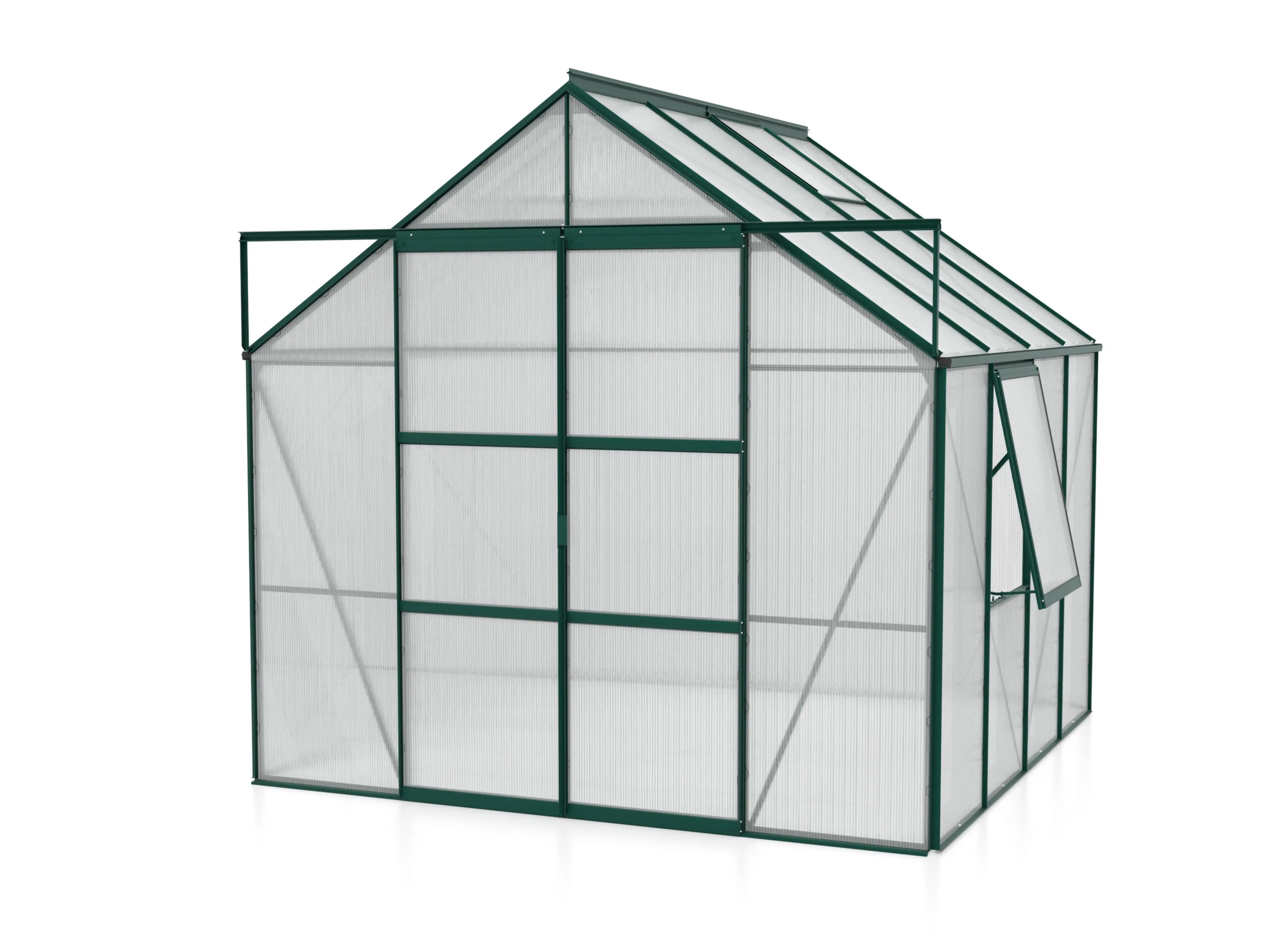 Jupiter a une hauteur impressionnante de 248 cm et une largeur de 257 cm. Une hauteur de bord de toit de 154 cm offre plus d’espace pour la tête et d’espace de travail. Une résistance supplémentaire est obtenue grâce à des plaques d’angle et des renforts dans toute la serre, afin que vous puissiez exercer plus de tension sans souci.