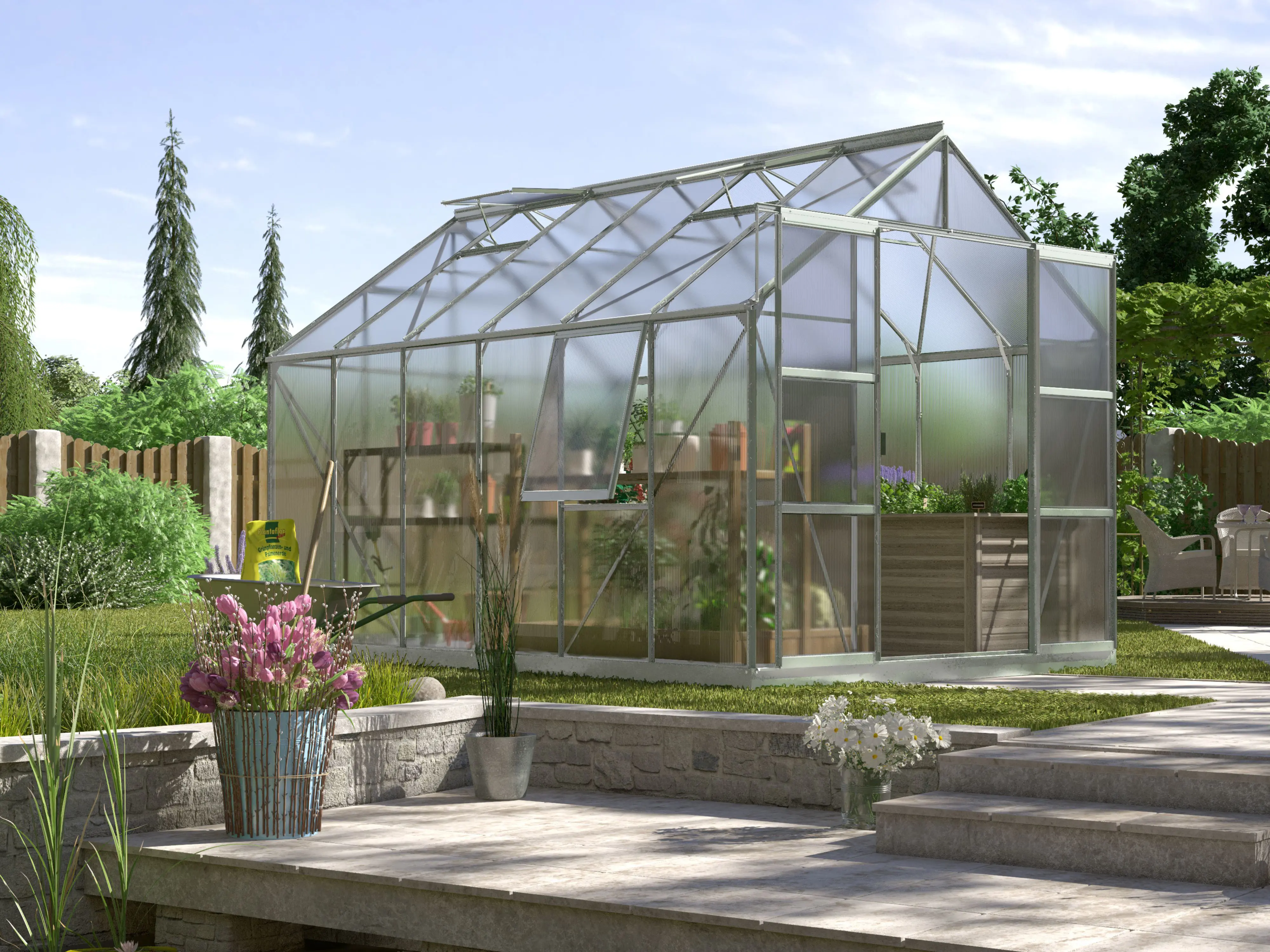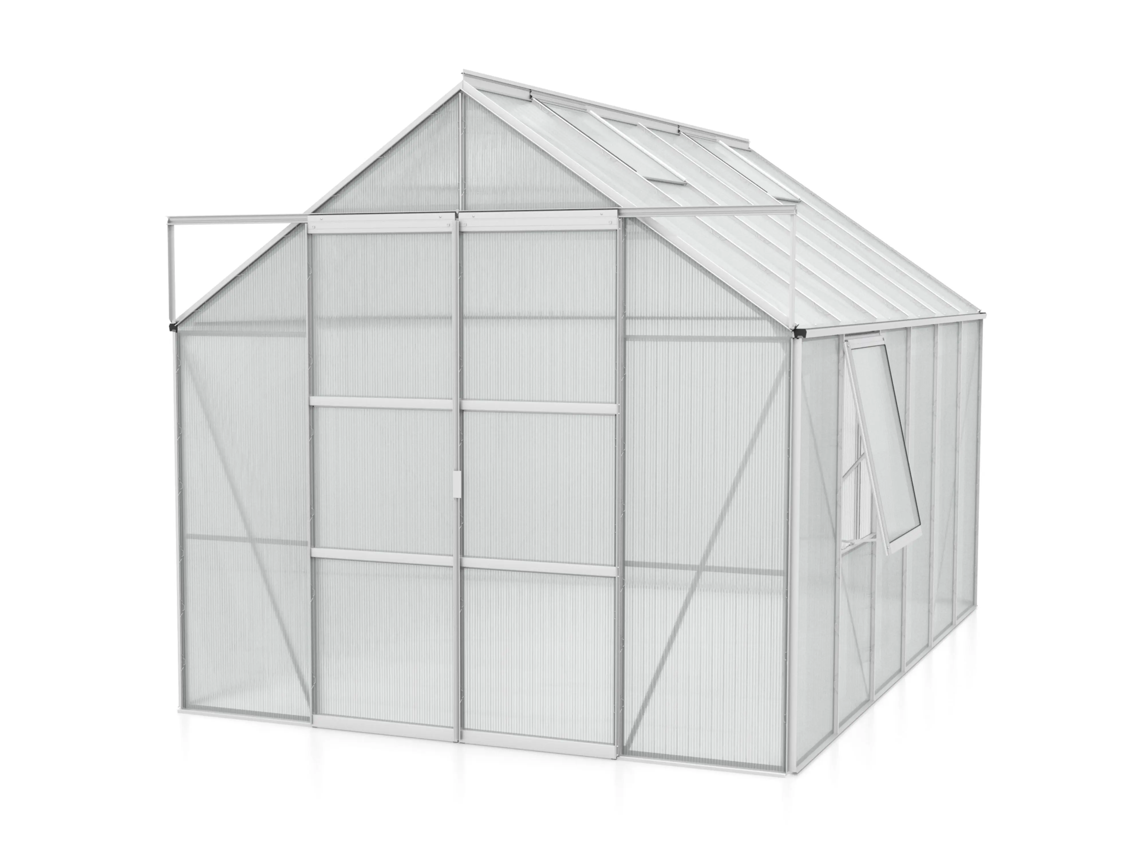 Jupiter a une hauteur impressionnante de 248 cm et une largeur de 257 cm. Une hauteur de bord de toit de 154 cm offre plus d’espace pour la tête et d’espace de travail. Une résistance supplémentaire est obtenue grâce à des plaques d’angle et des renforts dans toute la serre, afin que vous puissiez exercer plus de tension sans souci.