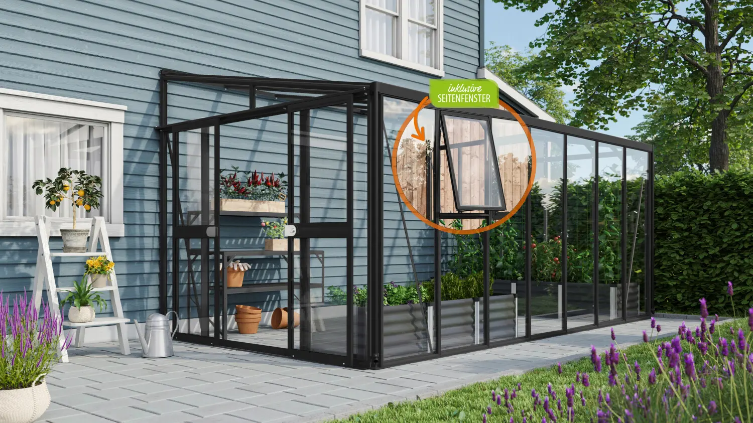 Les parois latérales sont faites de verre de sécurité (ESG) cristallin de 3 mm d’épaisseur , tandis que le toit est équipé de plaques de polycarbonate à double paroi de 10 mm d’épaisseur. Celles-ci protègent les plantes des rayons du soleil éclatant, maintiennent une température stable et résistent aux branches qui tombent.