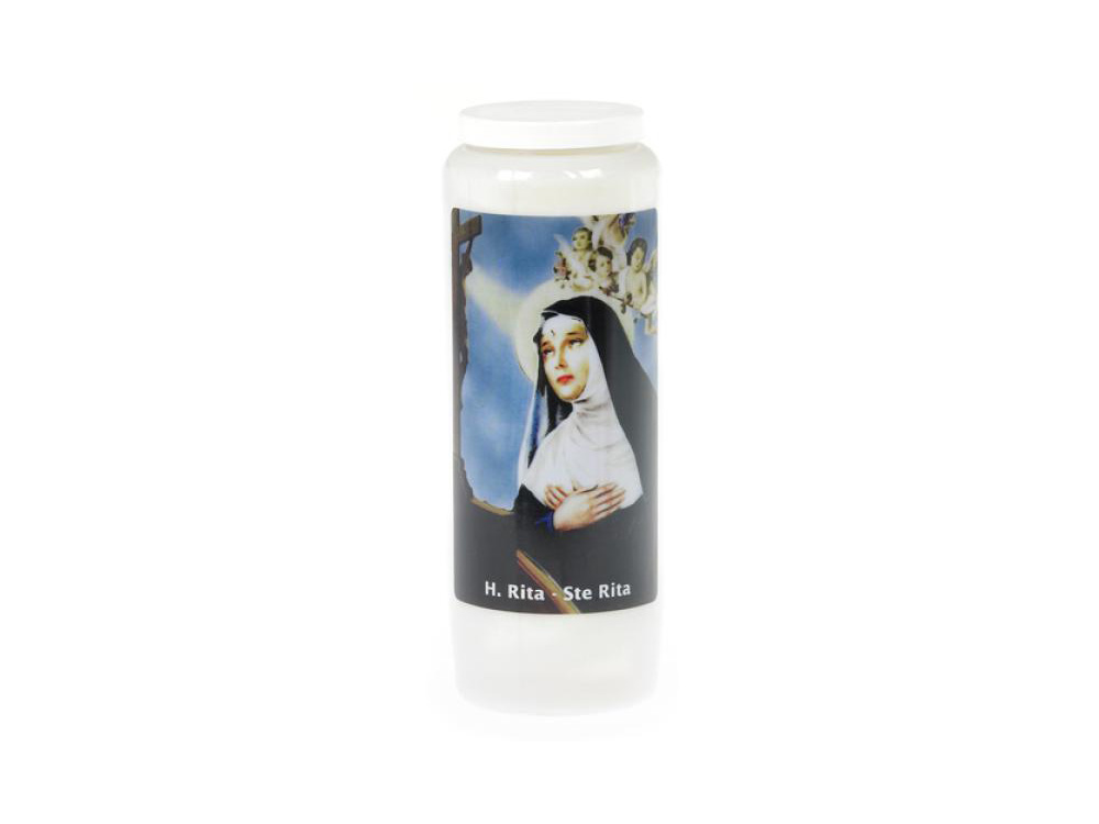 La bougie est dans un support en plastique transparent avec une image de Sainte Rita et l’inscription « H. Rita - Ste Rita ». Sainte Rita est connue comme la patronne des cas désespérés. Entre autres choses, elle est invoquée pour son anxiété liée aux examens et n’abandonne personne qui lui demande de l’aide avec confiance et dévouement.