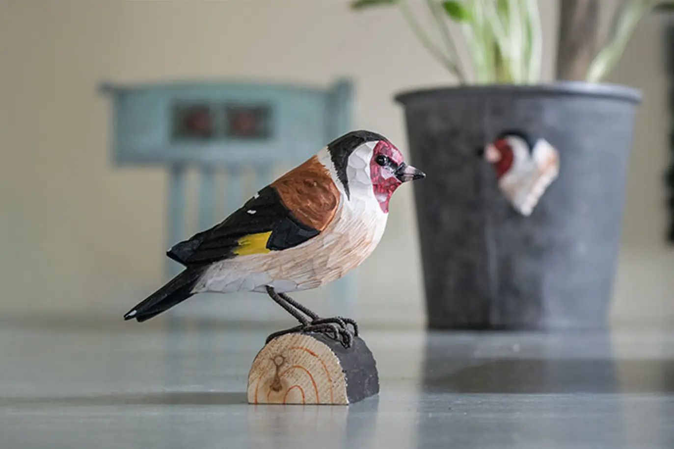 Chardonneret ou chardonneret en bois traditionnellement dessiné. Le chardonneret est exposé grandeur nature et peint avec une peinture écologique. La figurine est accompagnée d’un bâton avec lequel l’oiseau peut être inséré dans un pot de fleurs pour la décoration.