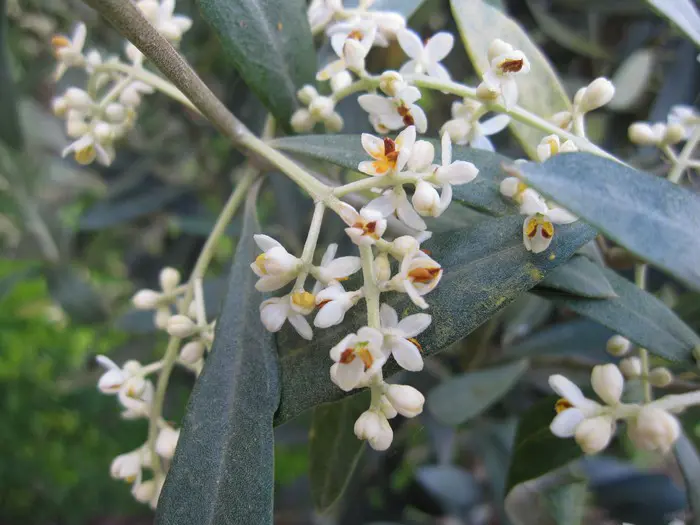 À la fin de l’été, de très petites fleurs blanches parfumées apparaissent en grappes courtes qui deviennent ensuite des olives comestibles. D’abord vert, puis violet.