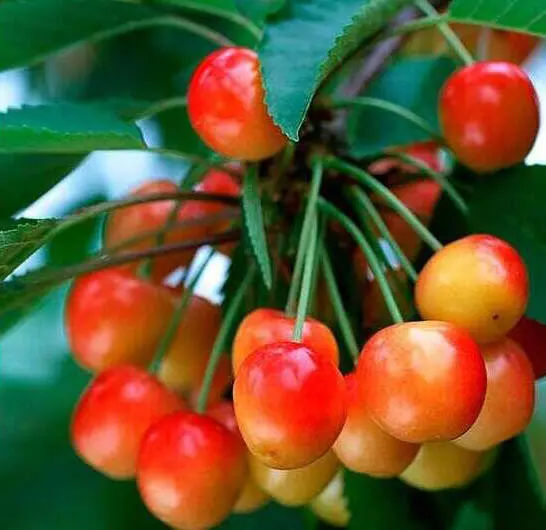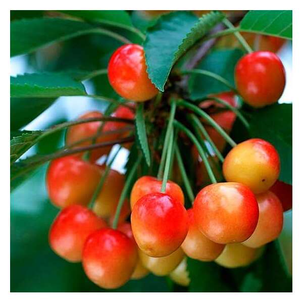 Les cerises sont jaunes au début mais deviennent rapidement rouges pâles avec une chair croustillante, ferme et douce et aigre.
