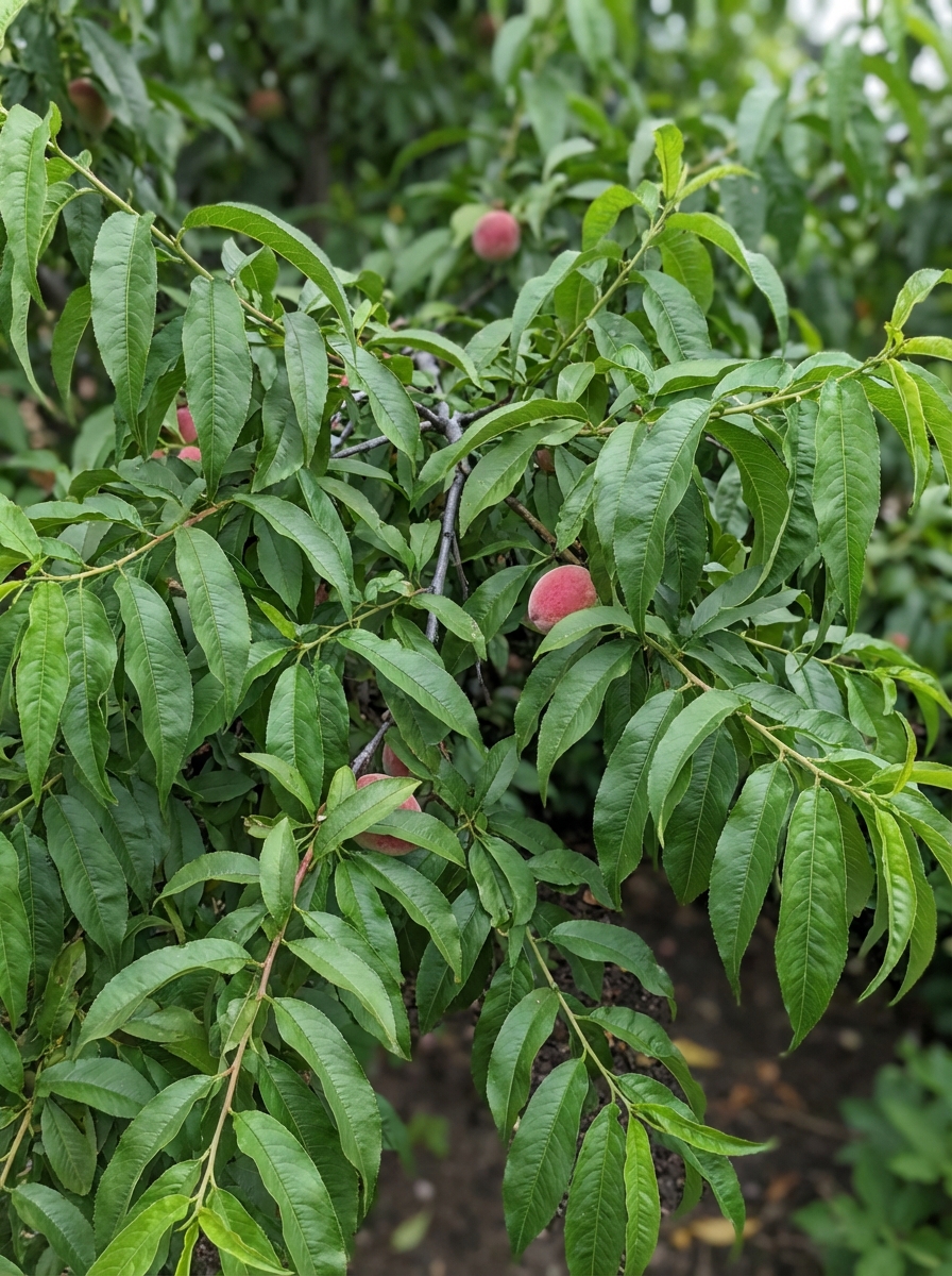 Prunus persica 'Reine Des Vergers' produit des pêches jaunes allant du rouge foncé au rouge violet sur le côté ensoleillé.