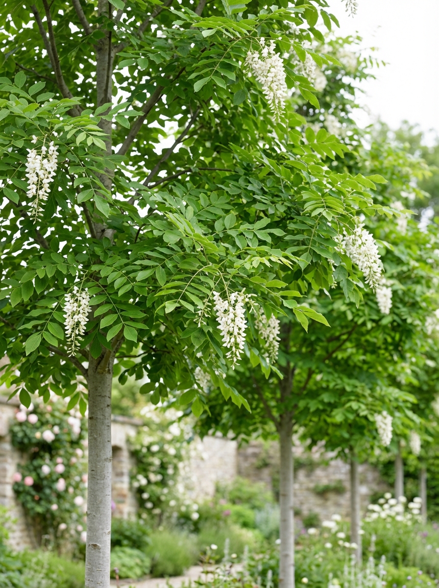 Des fleurs avec de longues panicules blanches pendantes et lâches.