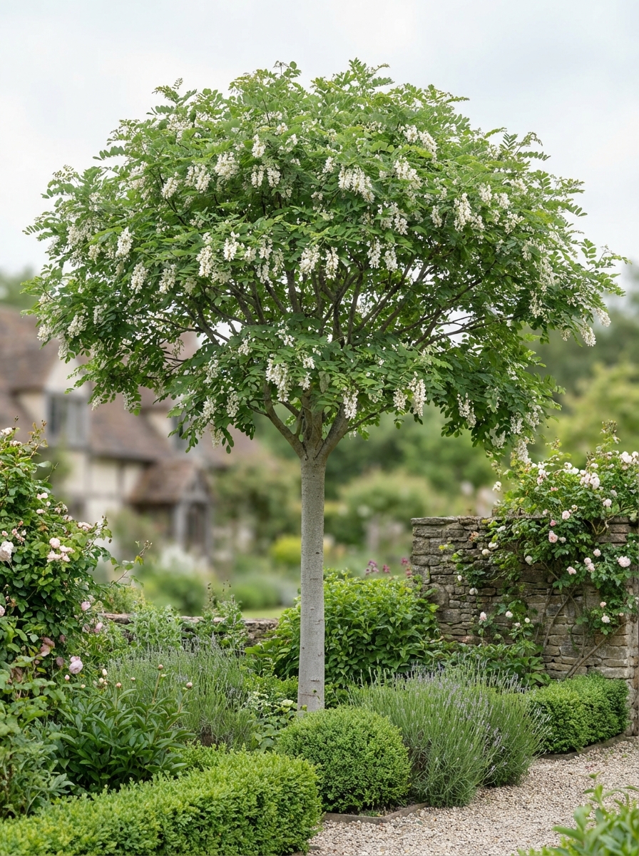 C’est un arbre à branches basses avec une cime large et aplatie et des feuilles à pinces impaires.