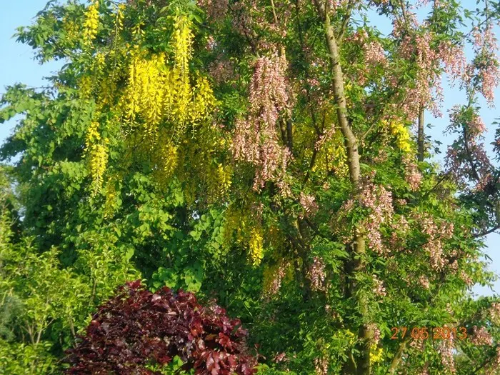 Laburnocytisus adamii est une chimère greffée (mélange de cellules) d’un Cytisus purpureus (balai pourpre) et d’un Laburnum anagyroides (laburnum). Posséder les qualités des deux.