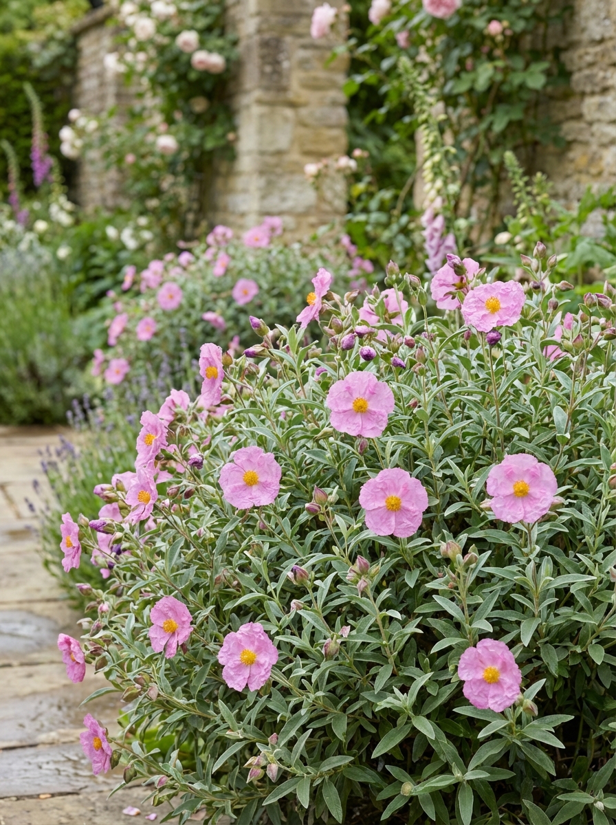 Les fleurs sont grandes (4 cm), argenté-rosées et d’un centre blanc autour d’étamines jaunes. Les pétales ressemblent à de la soie froissée.