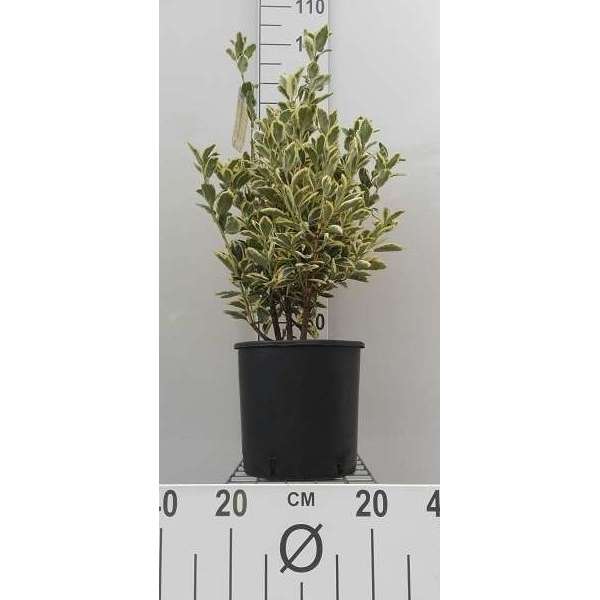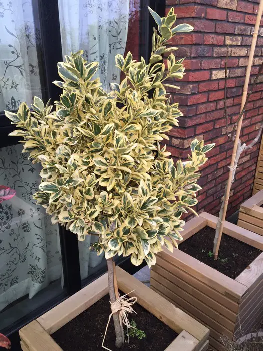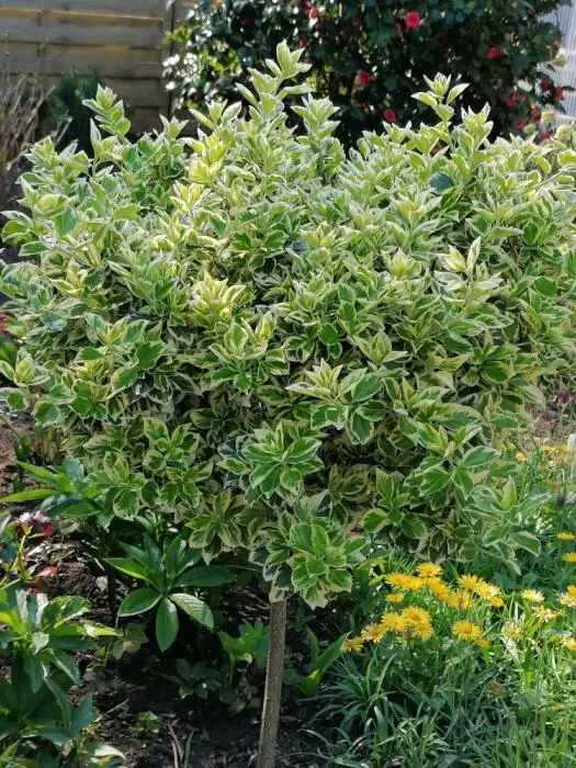 Euonymus japonicus 'Bravo' forme un arbuste pyramidal dressé composé de feuilles brillantes, coriaceuses, gris-vert, avec un bord jaune pâle à blanc crème.