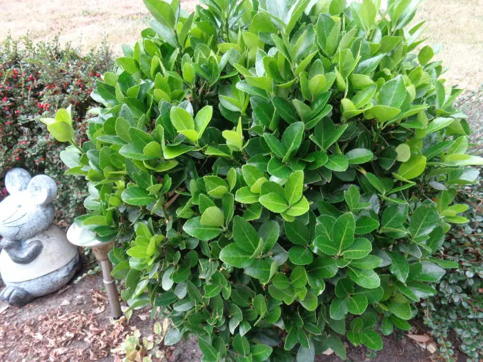 Euonymus japonicus 'Microphyllus' forme un arbuste sphérique compact composé de petites feuilles vert moyen, brillantes et allongées.