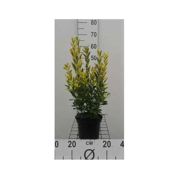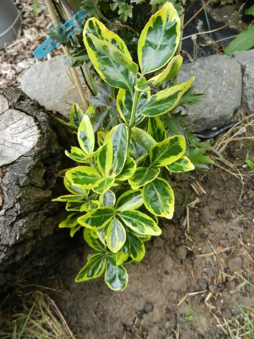 Euonymus japonicus 'Ovatus aureus' : forme un arbuste dense, compact et droit, composé de feuilles vertes brillantes, coriaces, avec des bords jaunis panachés et des dents irrégulières.