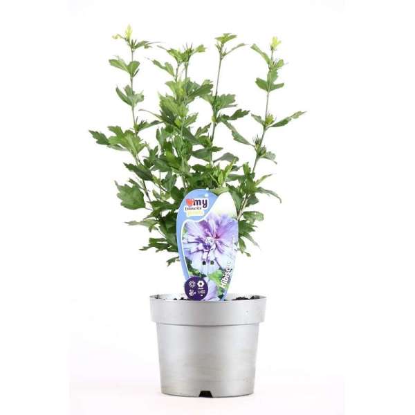 Hibiscus syriacus 'Blue Chiffon' est un arbuste dressé au caractère compact et aux feuilles vert foncé qui jaunissent en automne.