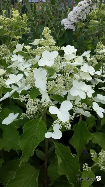 Hydrangea paniculata 'Butterfly' est un cultivar bas avec des fleurs blanches en forme de panache.