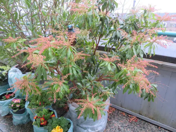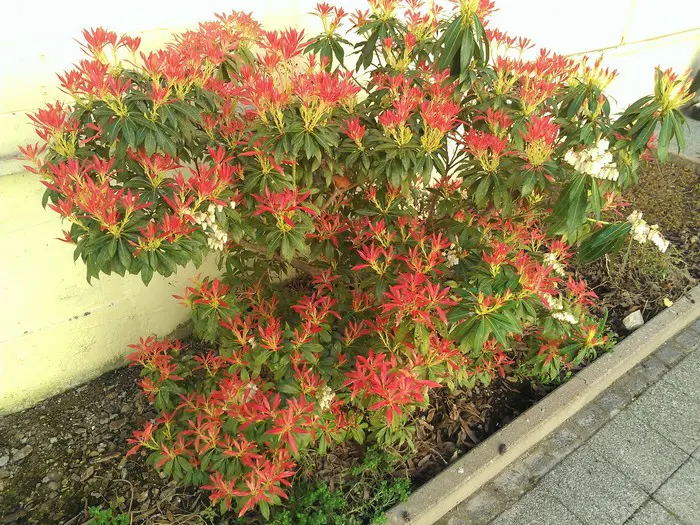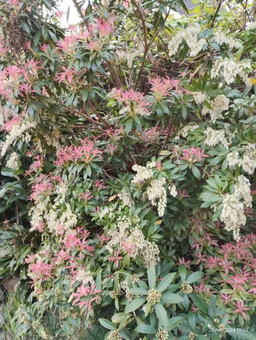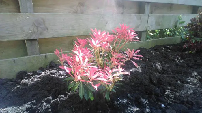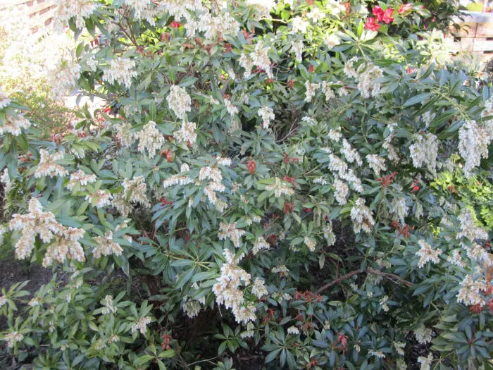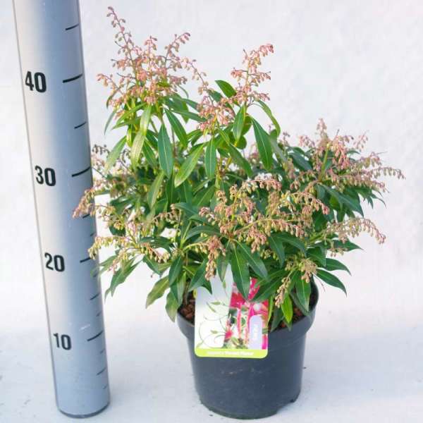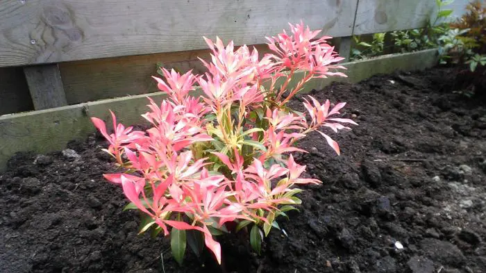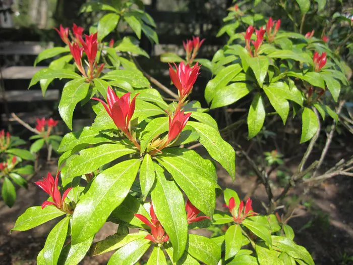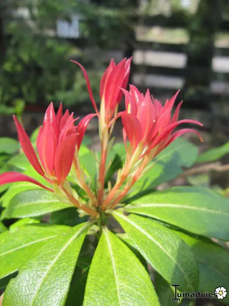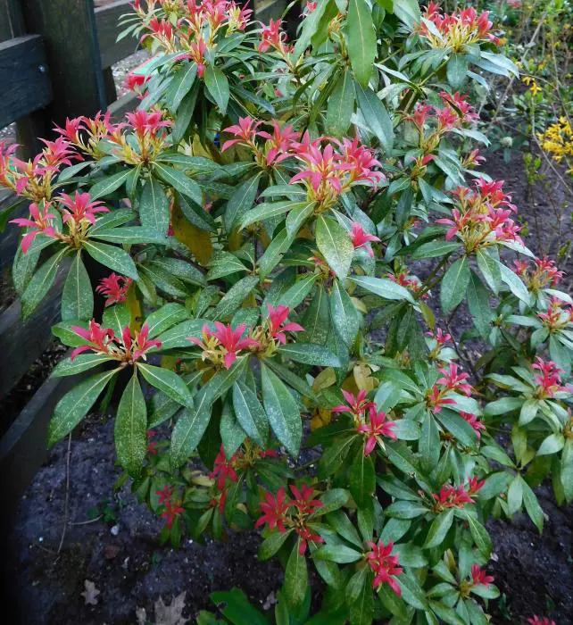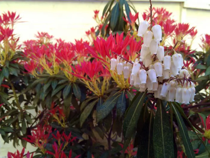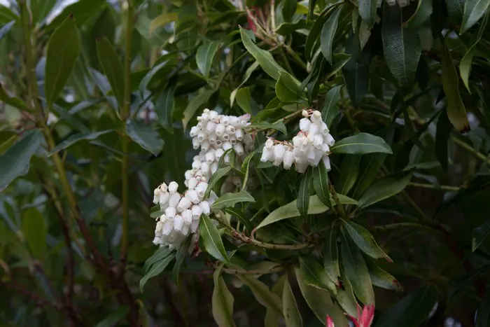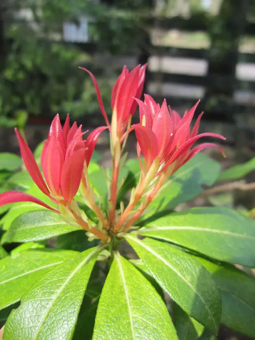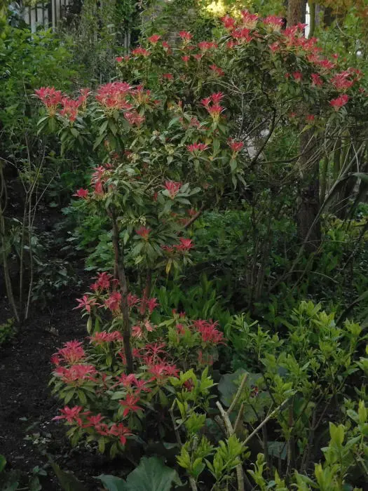 Pieris 'Flamme de la Forêt' est un arbuste densément ramifié, dressé, doté d’un habit touffu et de magnifiques feuilles vert brillant qui poussent du rouge au rose corail au printemps.