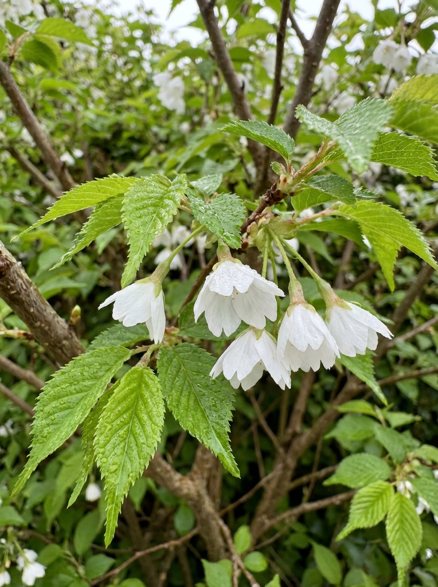 Prunus incisa 'Yamadei' est un arbre buisson à croissance lente, couvert de fleurs blanches comme neige en forme de cloche. Celles-ci fleurissent à partir de bourgeons vert vif.