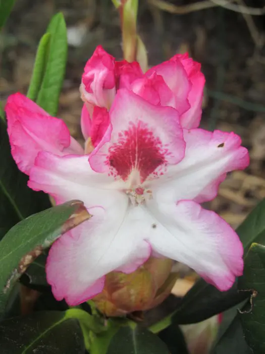 Le Rhododendron « Charmant de Hachmann » forme un large arbuste (160 cm) avec de grandes fleurs. Les bourgeons floraux rose-rouge fleurissent en blanc avec un bord rose-rouge et une macule rouge foncé.