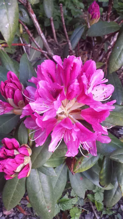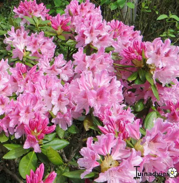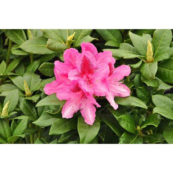 Le rhododendron 'Cosmopolitan fleurit d’un rose pâle avec une tache rouge foncé et atteint une hauteur de 250 cm.