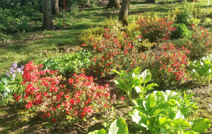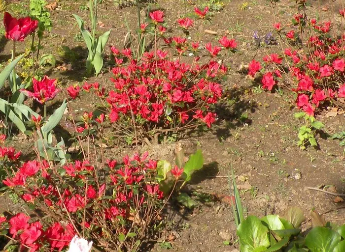 Rhododendron 'Stewartstonian' (azalée) fleurit avec des fleurs rouge-orangées saisissantes.Il faut un endroit abrité contre le vent froid dans le jardin, mieux protégé du soleil éclatant de l’après-midi.
