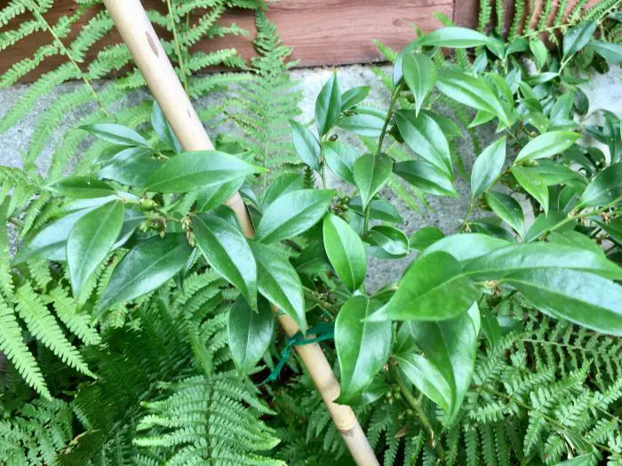 Les feuilles elliptiques sont vert foncé et brillantes, légèrement plus grandes que celles du Buxus.