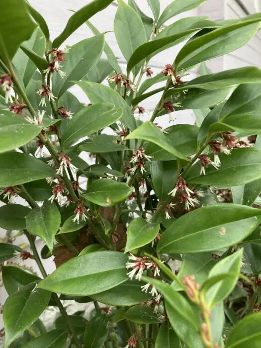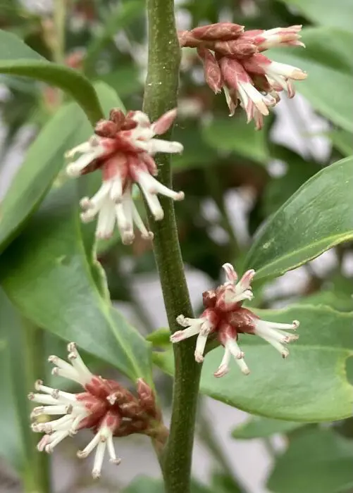 Sarcococca orientalis est un arbuste parfumé originaire de Chine aux fleurs d’un blanc rosé.