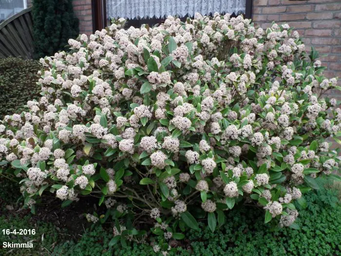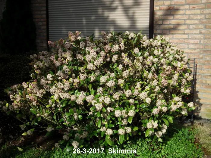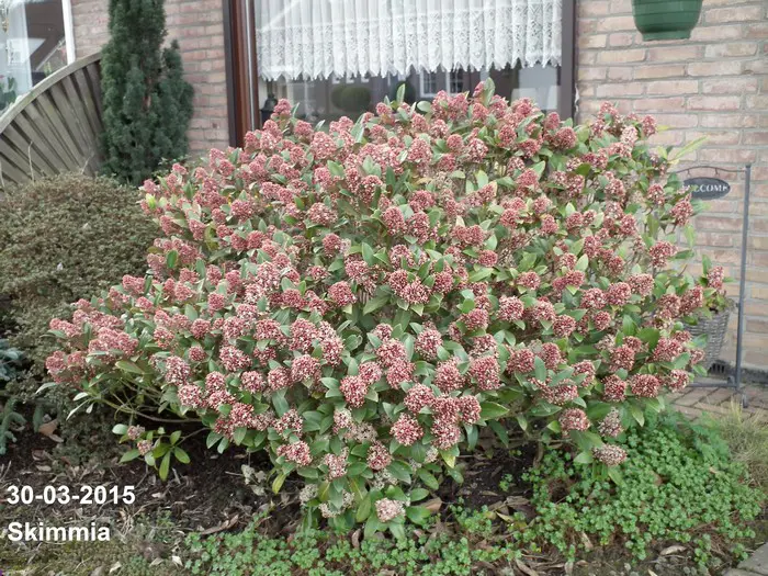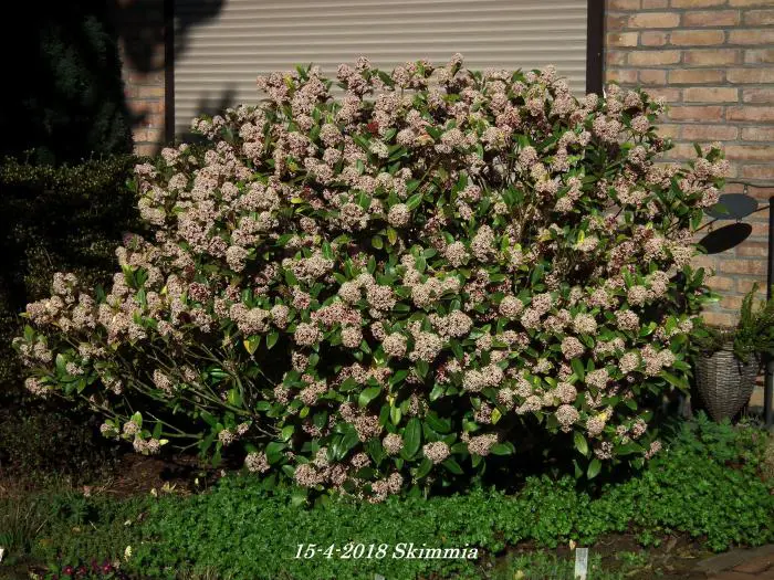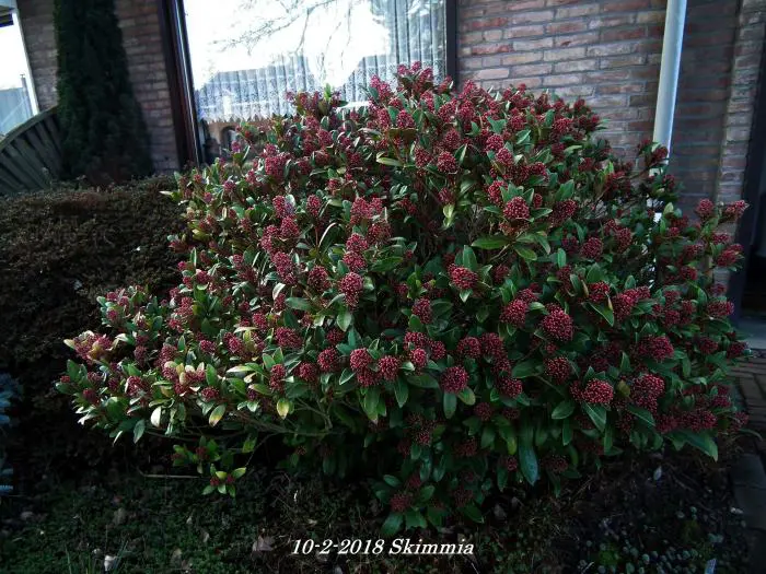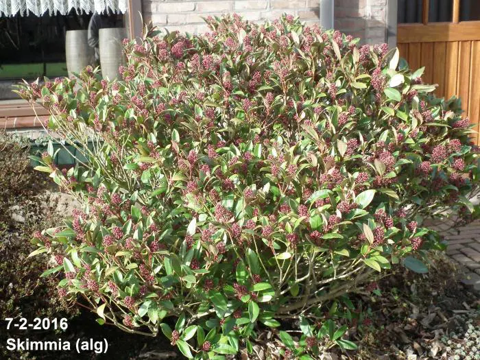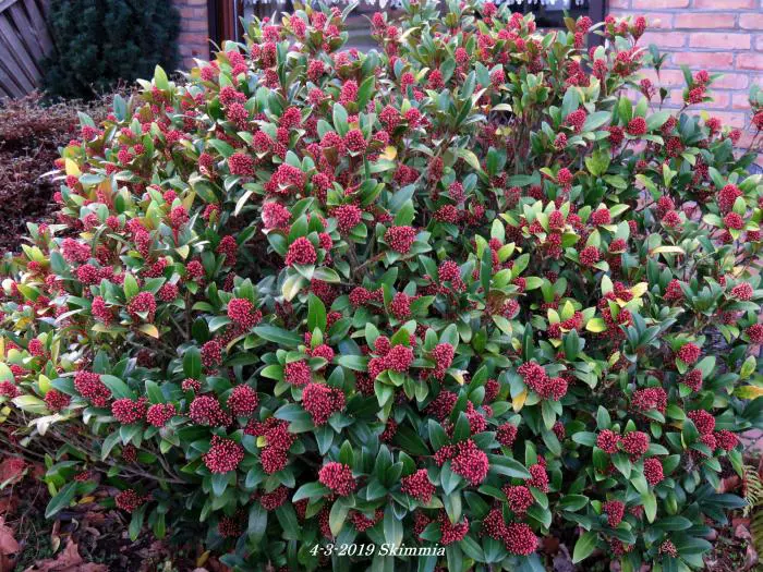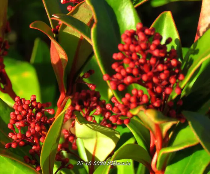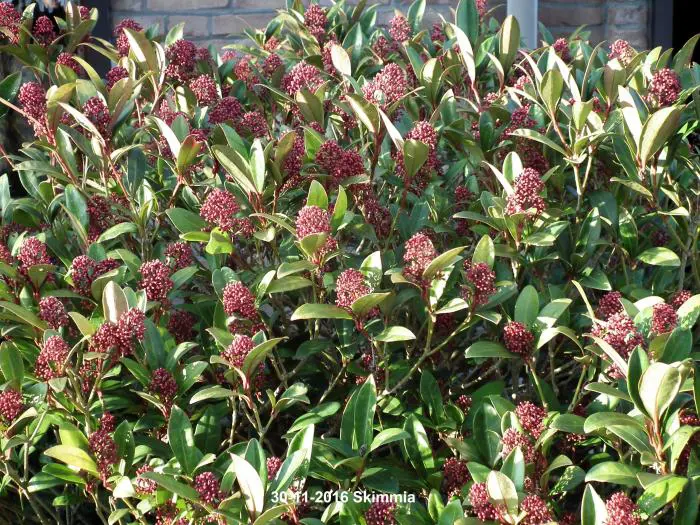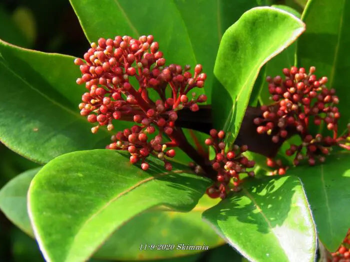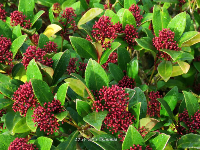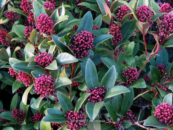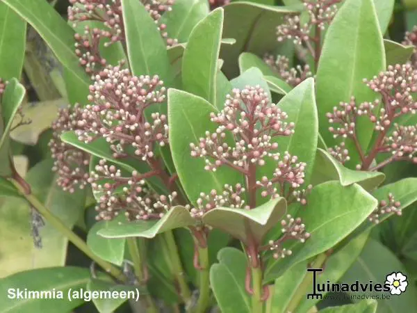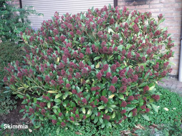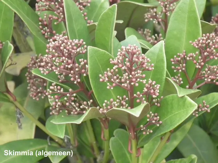 La skimmia est une plante particulièrement belle, persistante avec des feuilles brillantes et cuireuses.