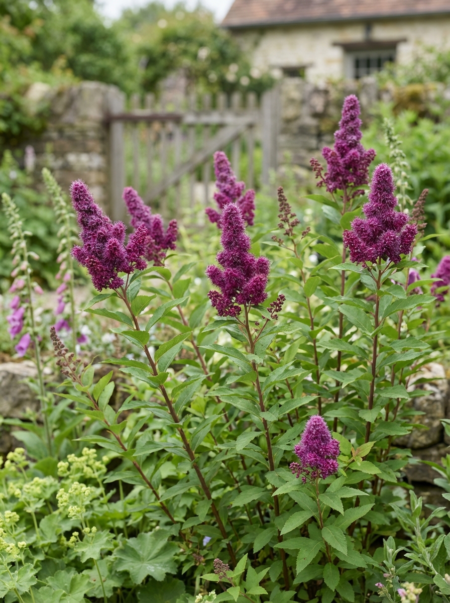 Spiraea x billiardii est un arbuste dressé et touffu, à feuilles denses de feuilles allongées, lancéolées, dentelées d’un vert foncé avec un ventre gris. En automne, elles prennent une couleur jaune automnale.