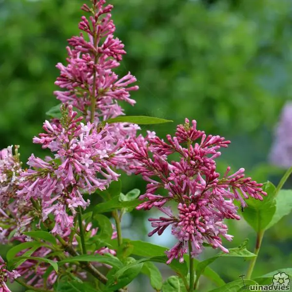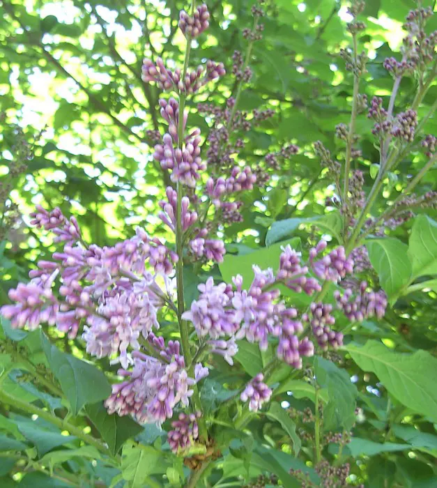 Syringa x prestoniae 'James MacFarlane' est un arbuste ou petit arbre dressé à rond, avec des feuilles ovales vert foncé et des panicules dressées à inclinées de fleurs parfumées lilas-roses en été.