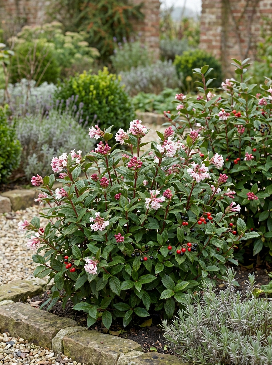 Viburnum farreri 'December Dwarf' est un large arbuste droit originaire de Chine, avec de longues feuilles ovales, fortement nerveuses, brillantes et vertes. Elles poussent d’un vert bronze et deviennent de magnifiques bruns-rouges à violets en automne.