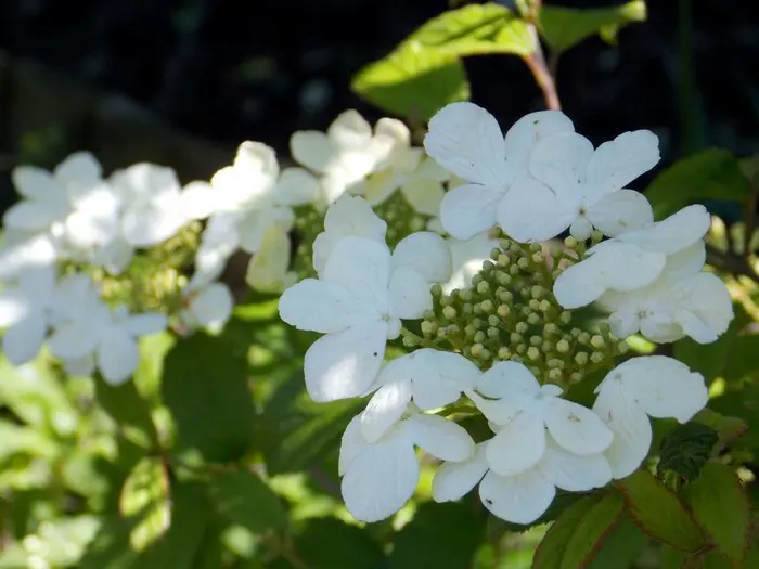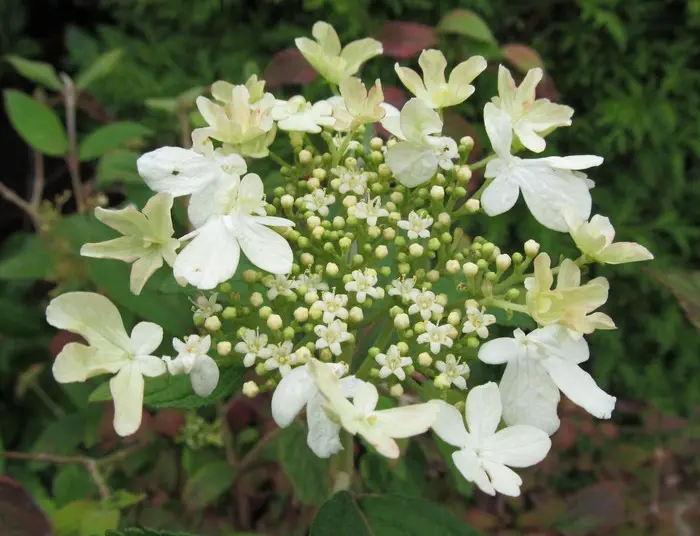 Fleurit tôt avec une large inflorescence aplatie et des fleurs blanches sur le bord stérile, suivies de grappes de fruits rouges qui deviennent noires.