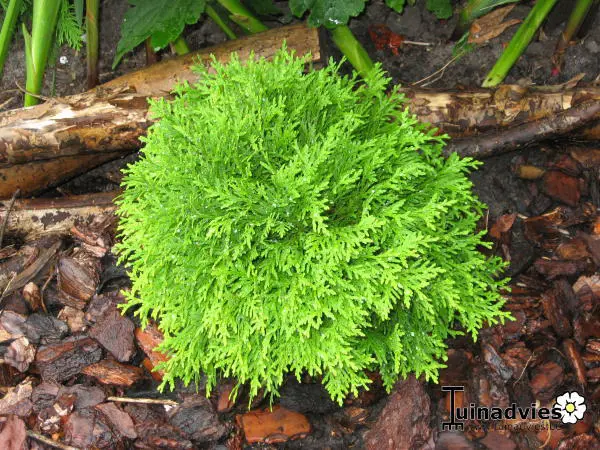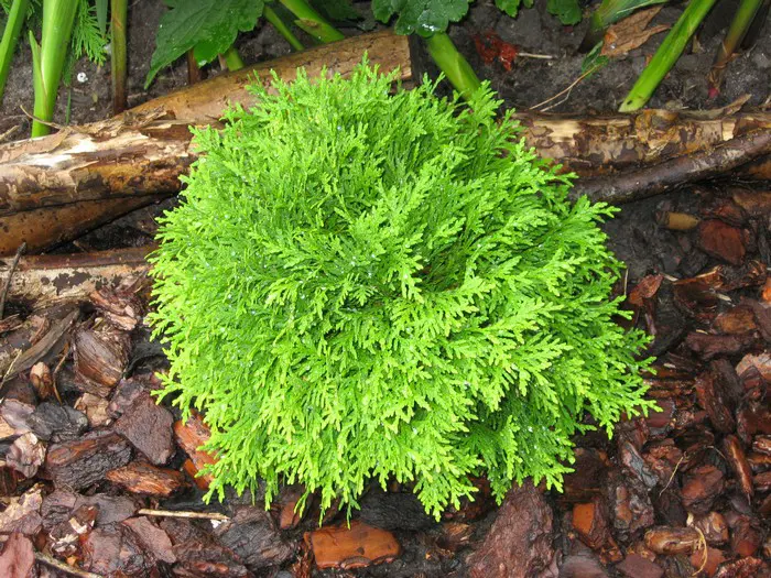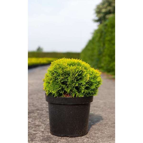 Thuja occidentalis 'Mirjam' est un conifère sphérique d’un jaune frappant qui devient beau en hiver en orange et vert bronze.