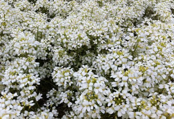 Elle forme un couvre-sol décoratif avec son feuillage dense et persistant et sa floraison abondante de grappes de fleurs blanches.