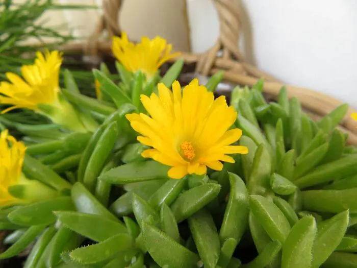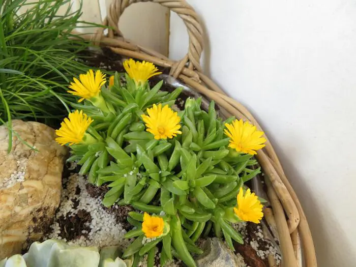 Delosperma congestum 'Yellow' fleurit avec des fleurs jaunes brillantes et possède des feuilles charnues et épaisses.