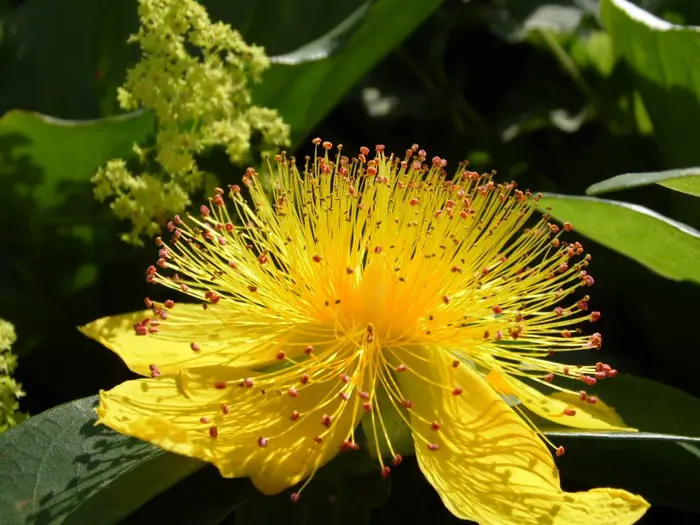 Hypericum calycinum fleurit tout l’été avec de grandes fleurs ondées jaune vif et longs étaminés centrales, portées sur des tiges fines au-dessus d’un feuillage vert.