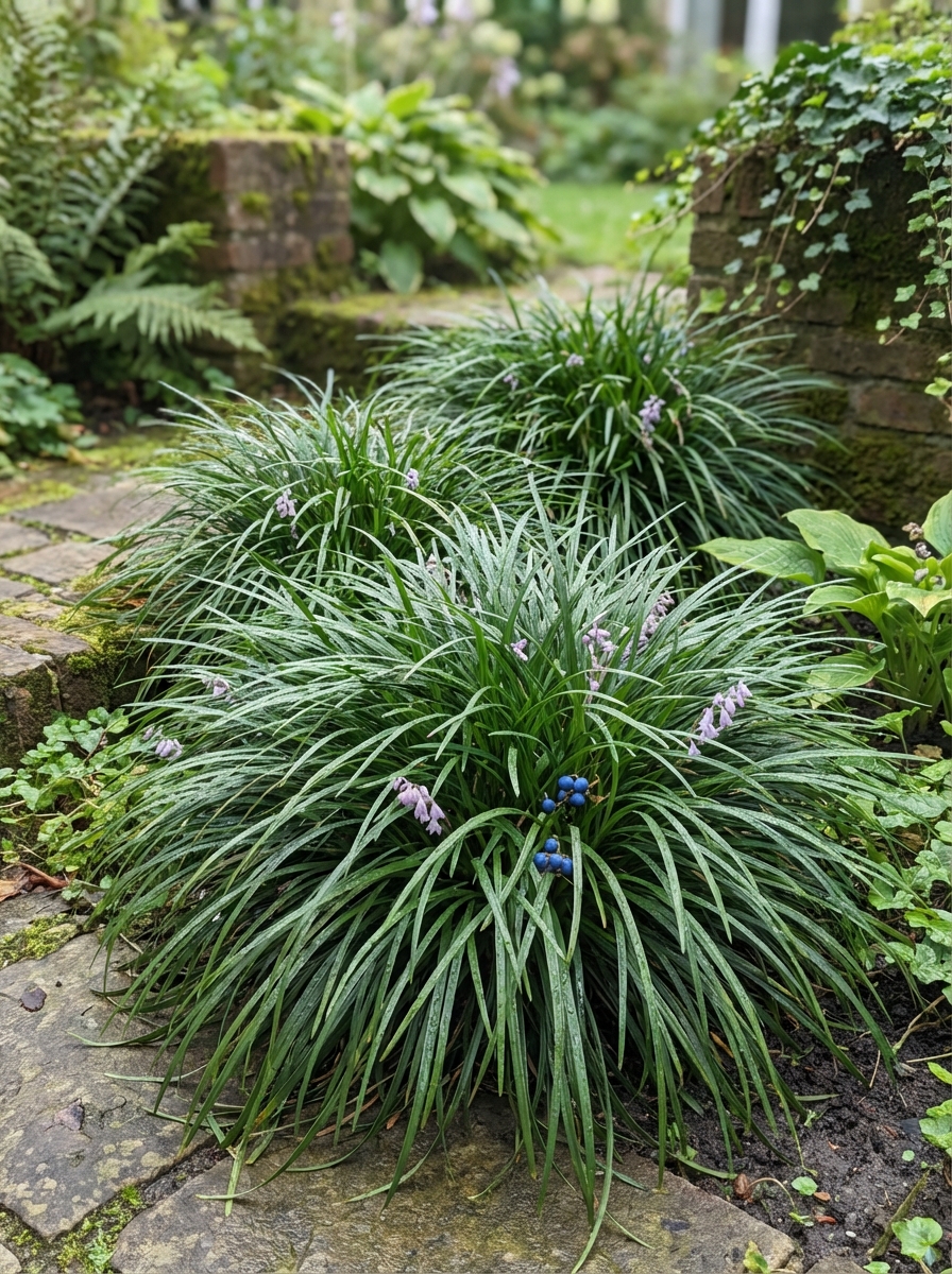 Ophiopogon japonicus, originaire de Chine, du Vietnam, d’Inde et du Japon, est principalement planté pour son feuillage herbeux persistant qui reste également magnifique durant l’hiver. Les feuilles vert foncé sont linéaires, longues de 20/40 cm.