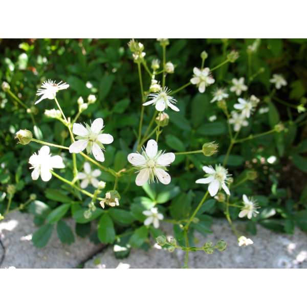 Potentilla tridentata 'Nuuk' est une plante forte avec des fleurs d’un blanc pur entre les feuilles vertes fraîches, bien ramifiées avec de fines brindilles.