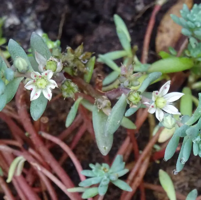 Sedum nevii 'Silver Frost' forme des rosettes denses de feuilles rondes, juteuses, argent-gris-vert, à teinte bronze.