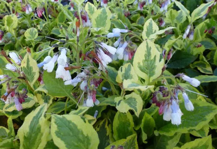 Symphytum grandiflorum 'Goldsmith' fleurit avec des fleurs tubulaires bleu clair.