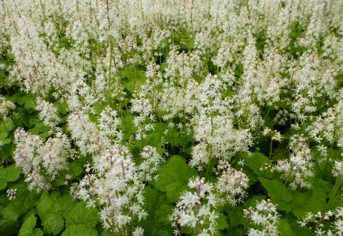 Tiarella cordifolia se propage par des brancs et constitue donc une couverture végétale idéale pour la croissance de grandes surfaces.