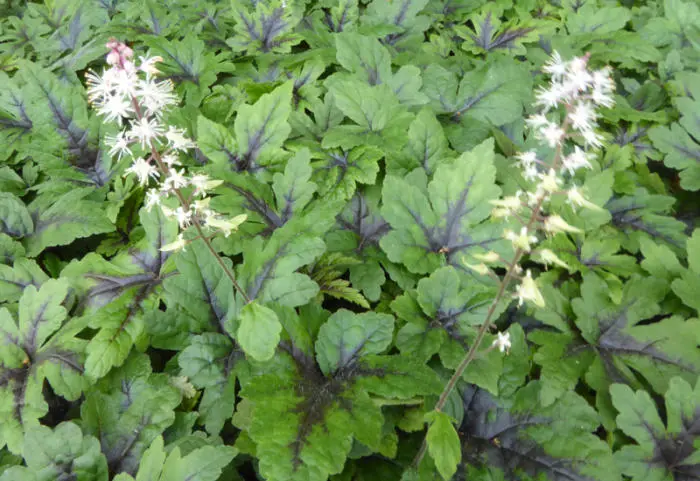 Tiarella 'Sugar and Spice' est une plante vivace avec des rosettes de feuilles vertes oïdes, brillantes, profondément lobées, avec des veines brun châtain à presque noires, ainsi que des grappes dressées de fleurs blanches et duveteuses issues de bourgeons roses.