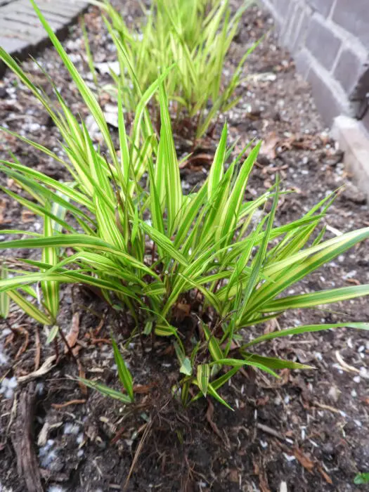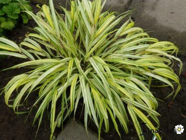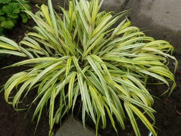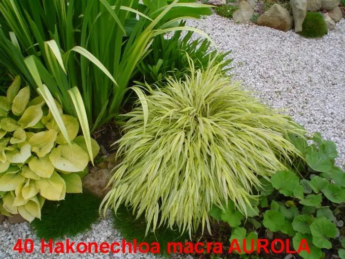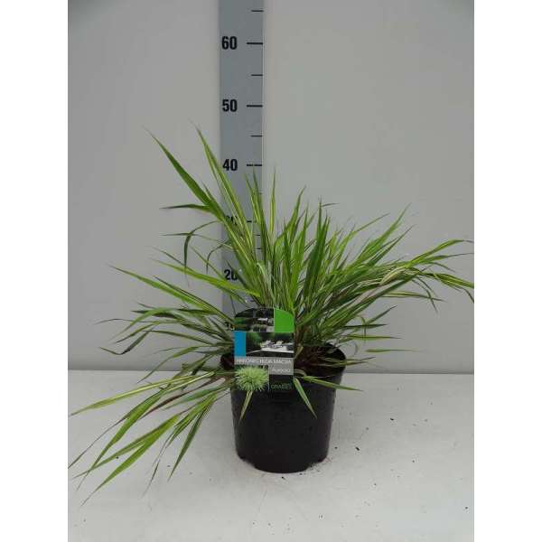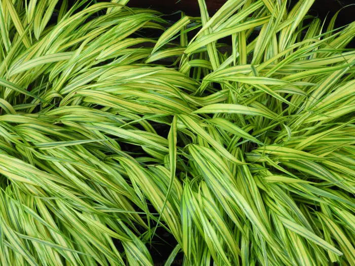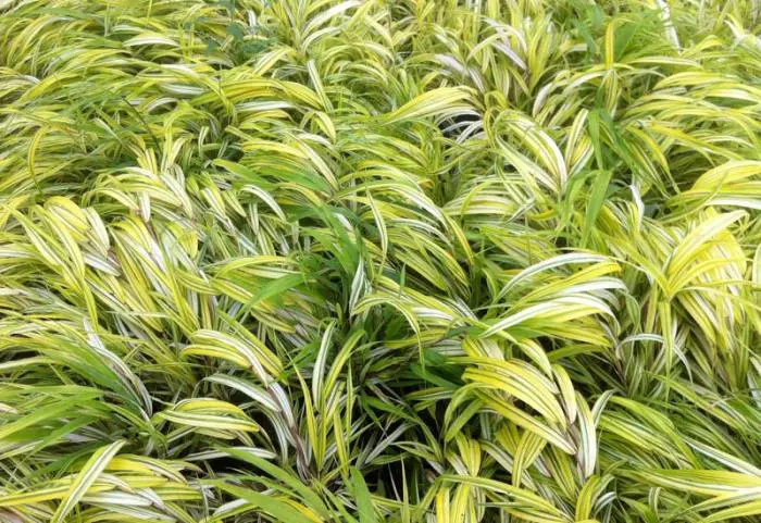 Hakonechloa macra 'Aureola' a des feuilles surplombées jaunes-variées et deviennent brun-rougeâtres à l’automne.