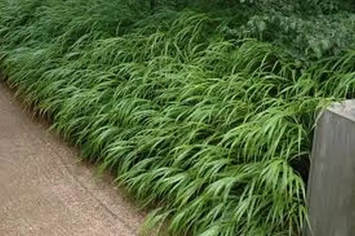 Hakonechloa macra forme un groupe de feuilles vertes gracieuses.