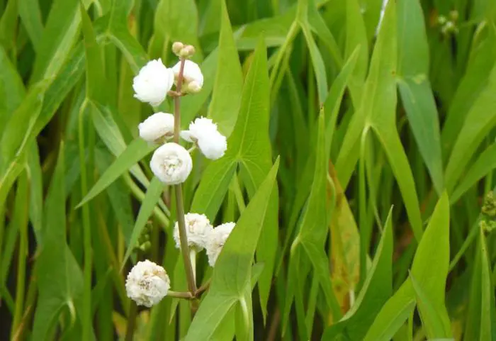 Les feuilles vertes brillantes en forme de flèche dépassent de l’eau, avec des fleurs blanches doubles bien remplies sur une longue tige.