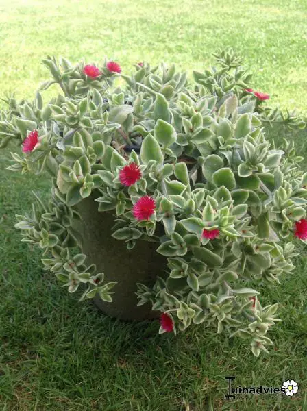 Dorotheanthus bellidiformis 'Mezoo Trailing Red' est originaire d’Afrique du Sud. A un habit pendulaire avec des feuilles succulentes (ivoire) panachées blanches et des fleurs rouges.