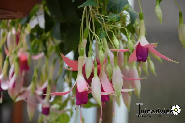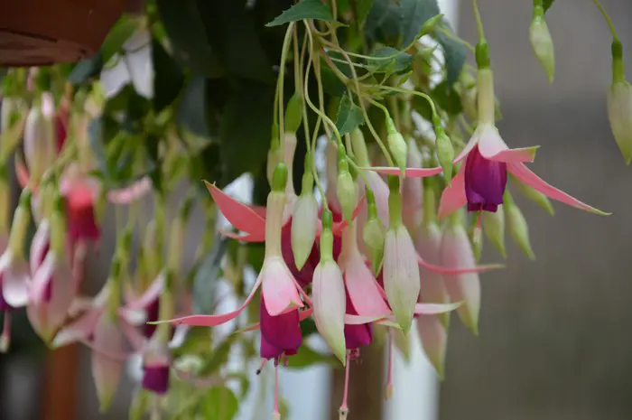 Le fuchsia 'President Margaret Slater' est une plante suspendue qui fleurit avec des fleurs en forme de cloche, la couronne est d’un violet magenta clair avec des sépales blancs et un rose saumon.