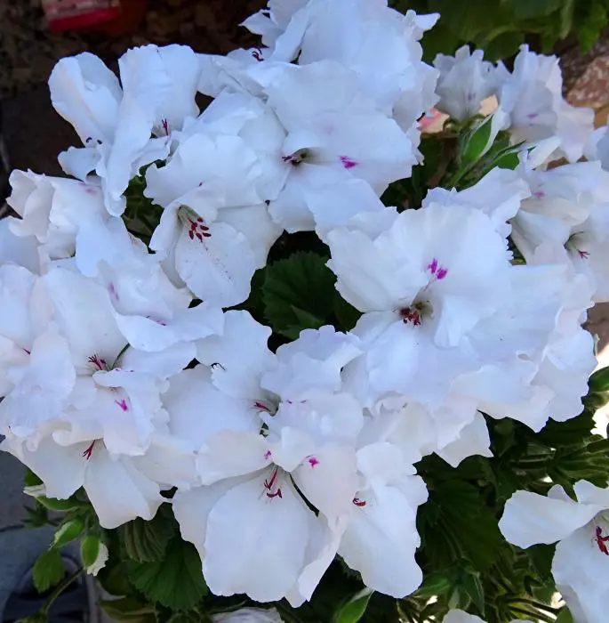 Pelargonium grandiflorum 'Jasmin' fleurit tout l’été. Les fleurs blanches présentent une marque rose au centre.