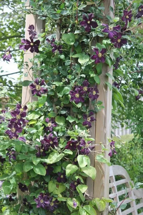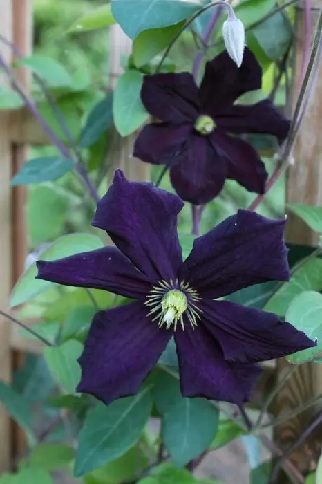 Les Clematis 'Romantika' sont presque noir-violaces à leur première ouverture, puis deviennent plus claires, devenant plus violettes foncés.